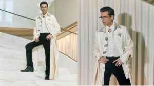 For the red carpet, Johar opted for a floor-length ivory bandhgala jacket, complete with a woven jacquard collar, which exuded opulence and sophistication. He styled it with a ruffle-detailed ivory shirt underneath, creating a visual play of textures and heritage. But it was the exquisite accessories that truly made this look unforgettable.