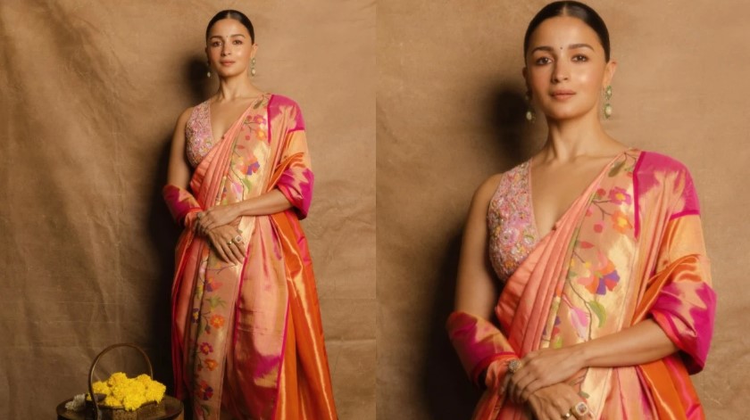 If you want to add regional flavor to your look, Alia Bhatt’s orange and pink Nauvari saree is a must-try. Pair it with minimal jewelry to achieve a simple yet striking Maharashtrian style.