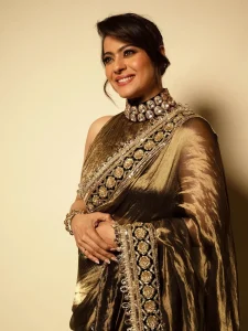 Bollywood star Kajol Devgan recently unveiled a regal look. She showcased a gilded sari designed by celebrated couturier Manish Malhotra.