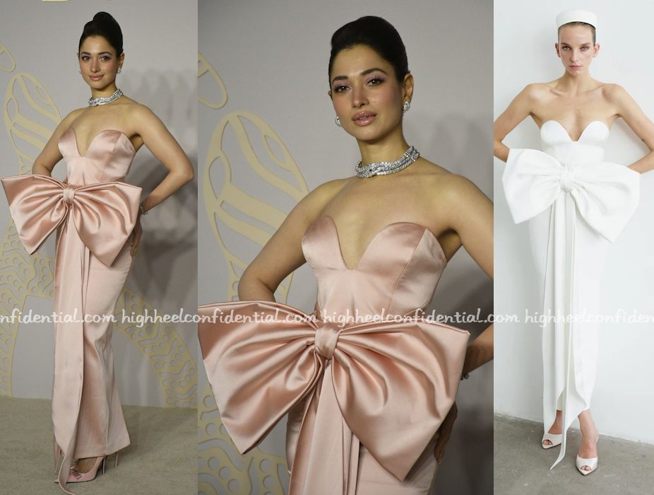 To complement the gown, Tamannaah chose matching Bvlgari Serpenti jewelry, including a delicate bow necklace and diamond earrings. These accessories enhanced the sophistication of her look while drawing attention to her neckline and shoulders. Additionally, the jewelry added a touch of sparkle without overwhelming the outfit, demonstrating a thoughtful balance between elegance and glamour.