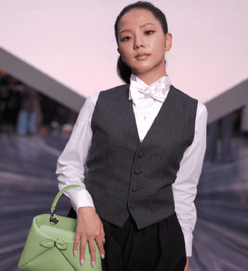 Jisoo wore a crisp white shirt paired with a matching bow tie under a charcoal gray vest, creating a sharp, sophisticated silhouette. Furthermore, she paired the outfit with black pleated shorts, introducing a youthful and contemporary twist to traditional menswear-inspired pieces. This combination perfectly balanced structure and femininity, highlighting her effortless style.