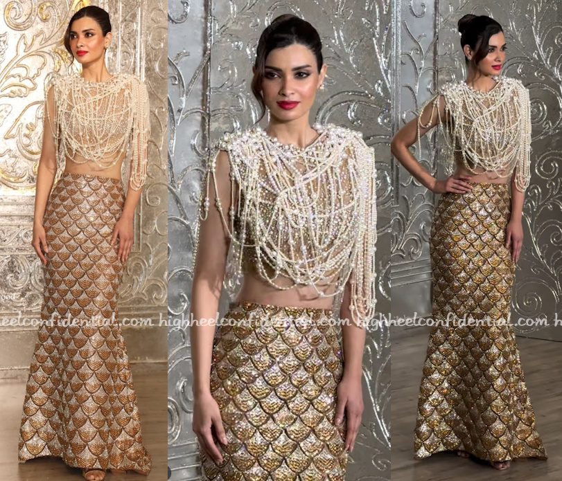 Diana’s outfit revolved around gold and yellow tones, featuring heavy sequin or embellishment work. One description paints her in a pearl-laced crop‐top matched with a fish-scale sequin skirt, a more contemporary two-piece that still carried a festive glimmer.