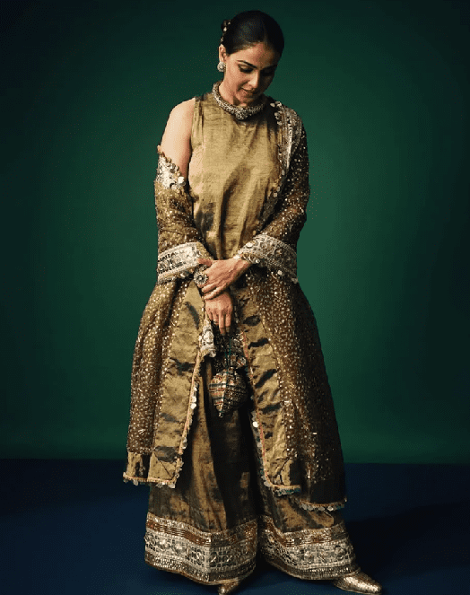 Deshmukh opted for a Benarasi lehenga in a rich olive-green shade, diverging from the typical gem-tones or vibrant reds common at glamorous events.