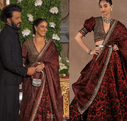 Genelia’s ensemble was designed by JJ Valaya, one of India’s couturiers, known for his intricate embroidery and luxurious fabrics. The rich rust chocolate hue perfectly complemented her warm skin tone and exuded a regal, festive vibe ideal for Diwali celebrations. The lehenga’s design balanced traditional grandeur with contemporary styling, making it a statement piece for the occasion.