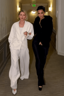 Kardashian’s ensemble featured a flowing silk skirt paired with a sharply tailored blazer. The blazer offered unique details: poodle-style cuffs and ruffled embellishments climbing up the shoulder and around the neck like a scarf. Her styling was completed with a high‐gloss up-do, dramatic lashes and strong brows—courtesy of stylist Soki Mak and hair-artist Igor Rosales‑Jackson.