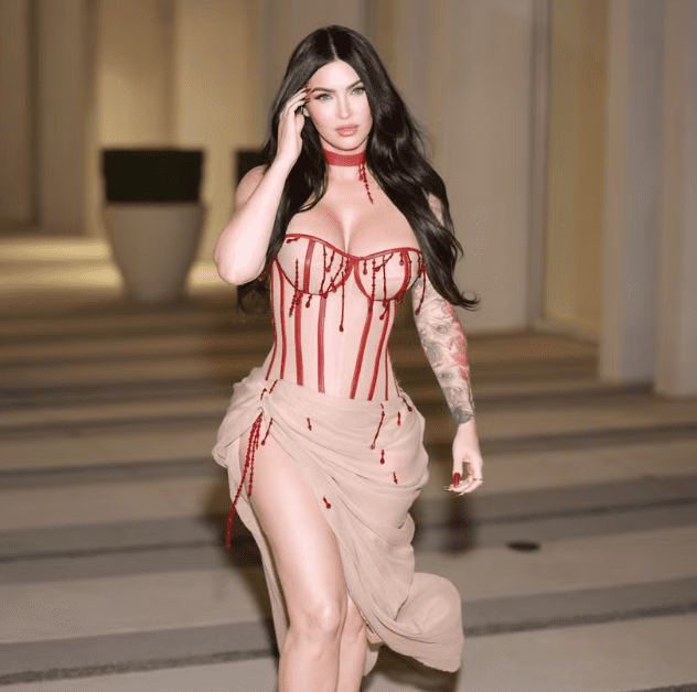At a screening of her cult-classic film Jennifer’s Body in Los Angeles, actress Megan Fox made a visually stunning arrival. She wore a nude, lace-up corset gown designed to resemble dripping blood. The effect was dramatic, bold and perfectly in theme with the movie’s horror roots.