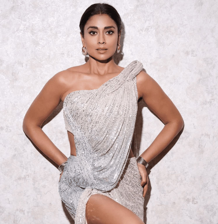 The gown featured a sleek one-shoulder silhouette with structured draping that accentuated Shriya’s figure. Its shimmering surface was the star: rich metallic panels contrasted with fluid lines, offering a high-fashion, modern interpretation of glamour.