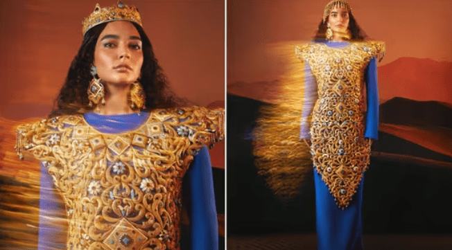 Therefore design draws inspiration from Emirati culture, bringing traditional patterns, arm-bracelet motifs and heritage aesthetics into a couture piece.