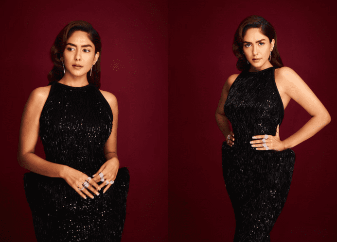 Actress Mrunal Thakur commanded attention as she stepped out in a structured, sequin-embellished gown by Gemy Maalouf, serving a powerful dose of high-octane glamour. The shimmering silhouette evoked a strong old-Hollywood allure, combining classic elegance with a modern red-carpet sensibility. The gown’s sculpted structure, fluid fall, and light-catching sequins worked in perfect harmony, creating a look that felt both dramatic and refined.