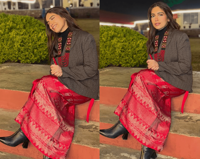 During her visit to the Assam Regimental Centre — the training ground for the Indian Army’s Assam Regiment — Bhumi Pednekar donned a striking ensemble that paired Assamese silk with elements of structured contemporary tailoring. Her outfit featured a red silk wrap skirt with intricate handwoven golden motifs, symbolising Northeast India’s rich textile heritage, layered over a smart grey blazer and traditional accessories that grounded the look in cultural depth.